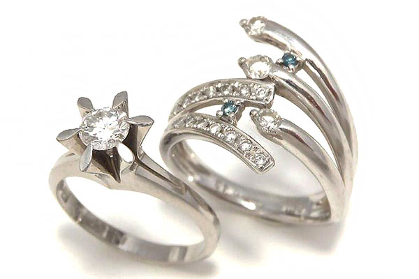 ずっと使わずにしまってあった立て爪の指輪を、リフォームフェアのチラシを見て、今風のデザインへ変えられないかと相談へ行きました。同じく持っていたファッションリングのブルーの石と合わせて、一本の指輪へ生まれ変わった姿に、とても満足しています。